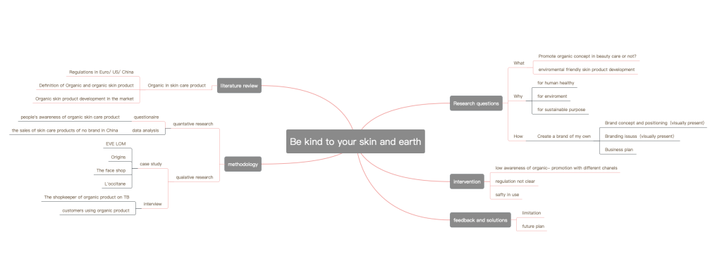 I tried to figure out my mind map of How to improve Chinese consumers’ awareness of Organic skin care products through art exhibitions and visual design. I divided the research into two major parts. One is research and the other one is intervention practise.
